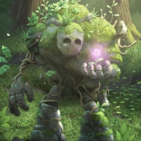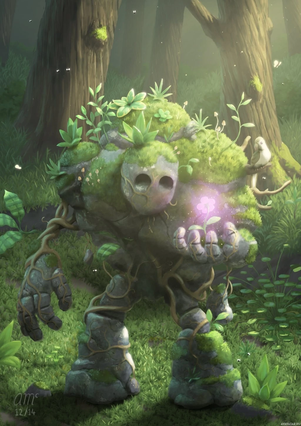 a humanoid shape with a large head that appears to be made of stone or concrete, decorated with mosses and fern-like plants, giving it a naturalistic appearance. It is holding what looks like an enchanted flower or