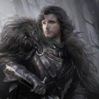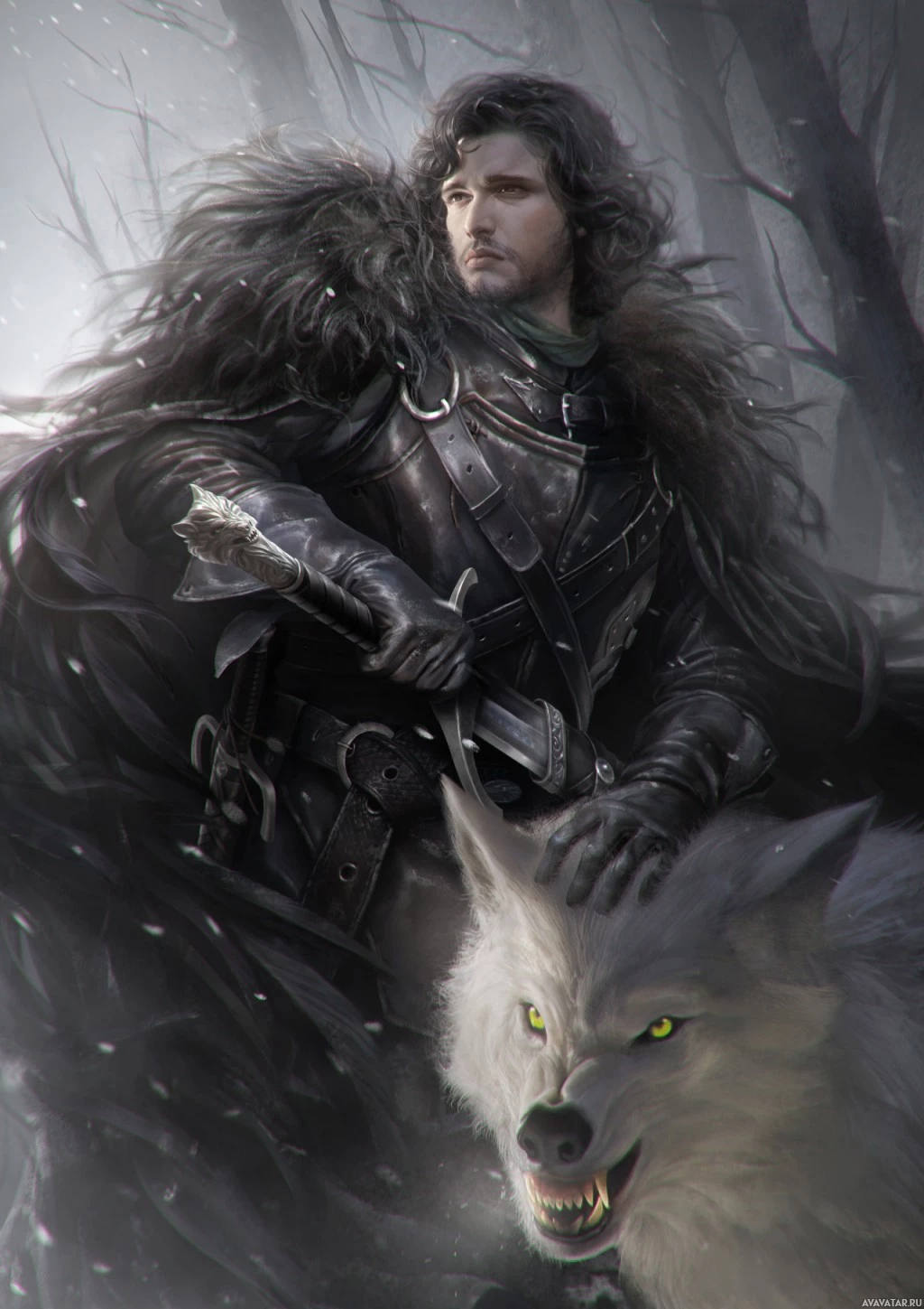 typical attire, consisting of fur-lined clothing and carrying a sword, suggesting he is prepared for battle or adventure. Additionally, there is a wolf by his side, which is also known as Ghost, Jon's