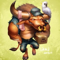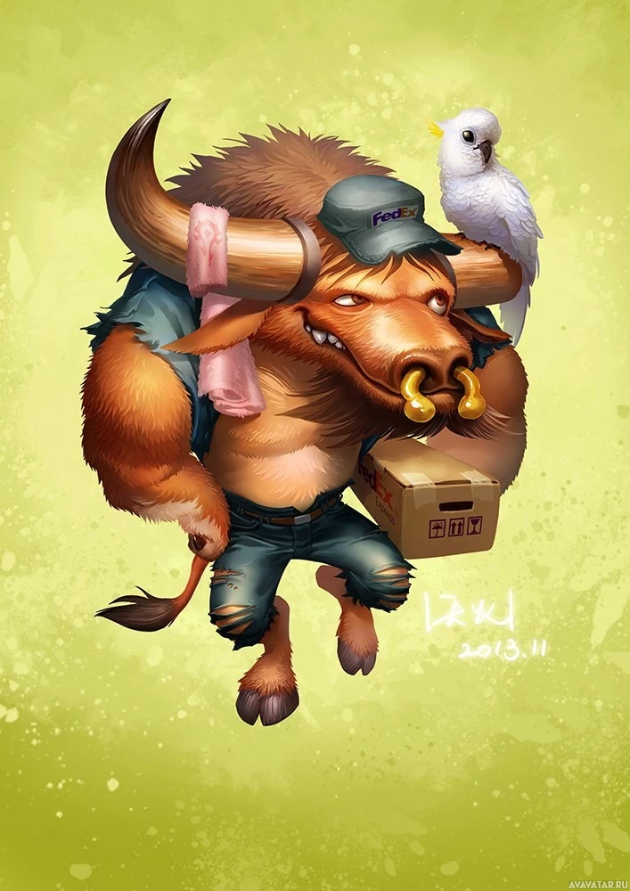 the body of a human, but with the head of a bull and what appears to be horns. It is also wearing a hat and glasses, which adds a humorous or whimsical element to