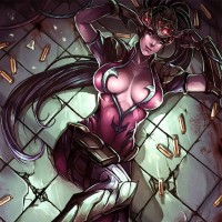 a seductive pose, lying on what appears to be a floor covered with shards of glass or tiles, with guns around her. The artwork has a dark and moody atmosphere, with the character's pose suggesting she may have been involved in combat.