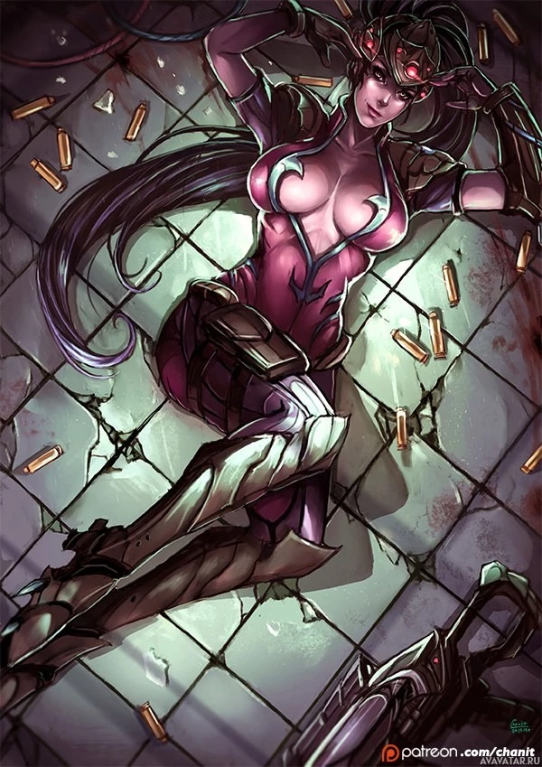 the video game "Overwatch," specifically Widowmaker, a character known for her skilled sniping abilities. She is depicted in