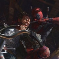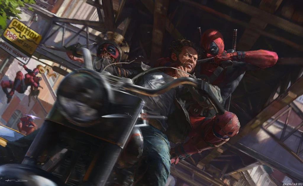 action sequence. Deadpool is in the foreground, wielding his characteristic guns, while Cable, wearing