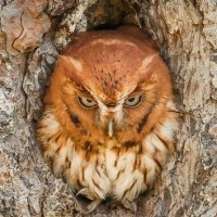 The image depicts a bird, specifically an owl, perched inside the hollowed-out