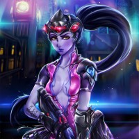 The image depicts an animated character that appears to be Widowmaker from
