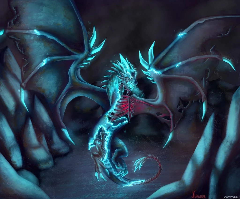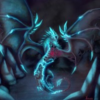 a fantastical creature, which resembles a dragon. It has blue and black scales, wings with spikes, and