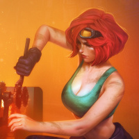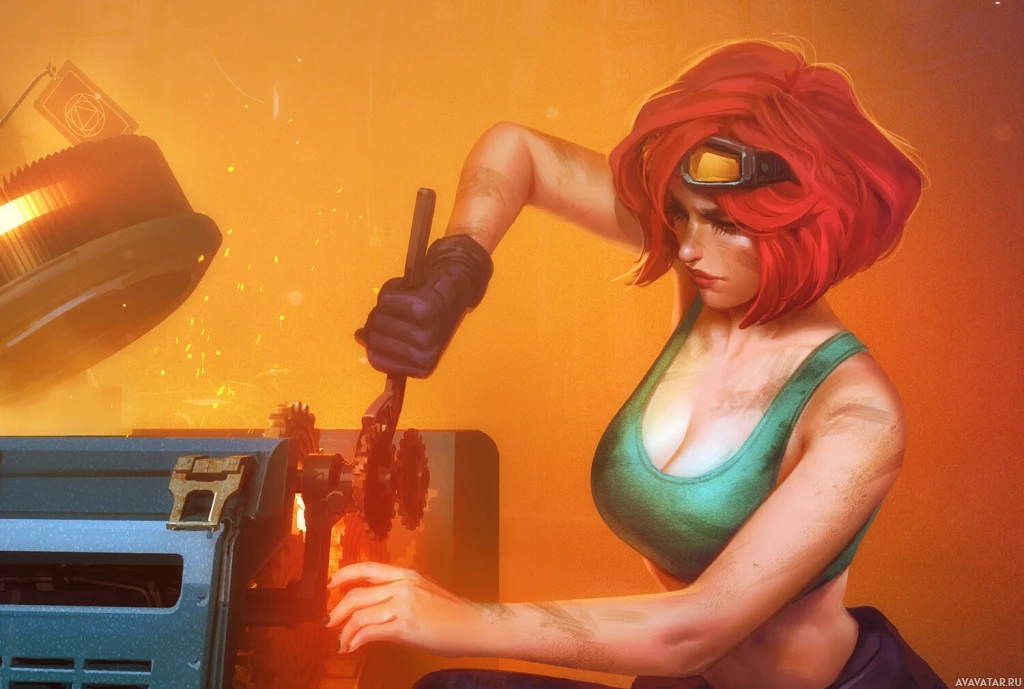 red hair, wearing what appears to be a tank top and gloves. She is holding onto a metal structure that has