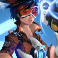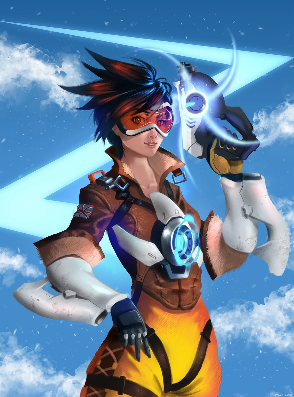 futuristic gear that includes a helmet with what appears to be a visor and a chest piece with glowing blue designs. In her right hand, she holds a weapon that seems to be a type of gun, and there's also a symbol on her left arm that looks like