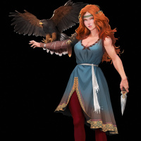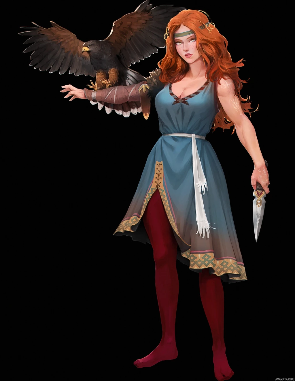 a young woman with red hair, wearing a dress with a cape and carrying a bird on her arm. She also has a falcon perched on her hand, suggesting she might have some connection or skill related to birds or hunting. The overall style of the image is detailed, indicative of