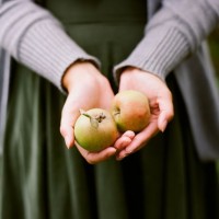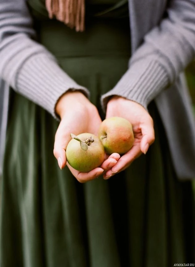 The image shows a person holding two apples in their hands. They appear to be outdoors, possibly in an orchard or