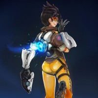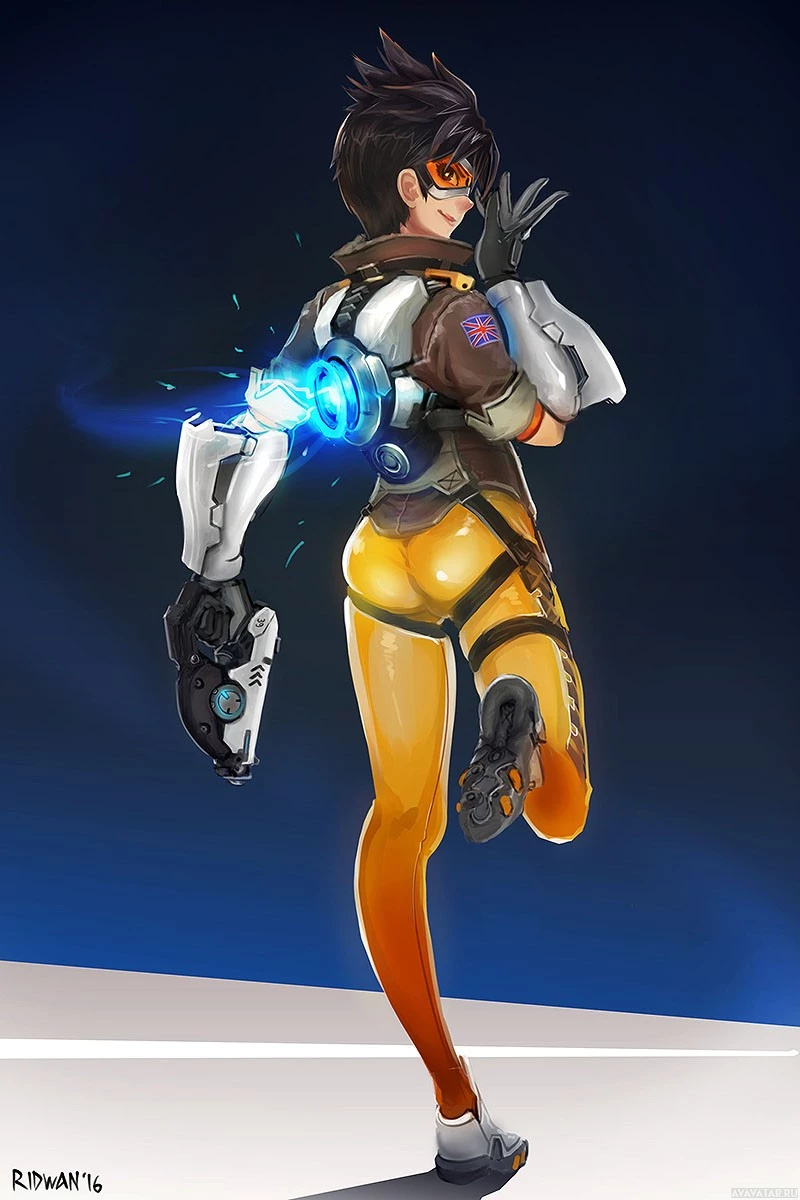 an animated character who appears to be Tracer from the game Overwatch. She is shown in