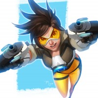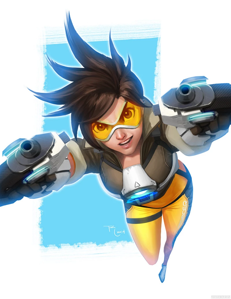 The image depicts an animated character known as Tracer from