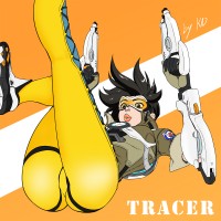 the Overwatch logo. The character is holding two weapons on either hand, and she has one leg stretched out to the side in a pose that suggests movement or action. The background is simple with