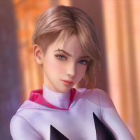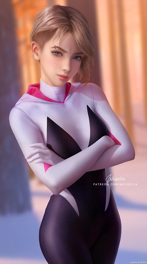 На картинке изображено цифровое произведение женского характера. У нее короткие светлые волосы, она носит черно-белый наряд, напоминающий костюм с розовыми акцентами на плечах и груди, и у нее руки опираются на бедра, глядя прямо на зрителя. Персонаж, по-видимому, нарисован в стиле, обычно связанном с видеоиграми или анимационными произведениями искусства.