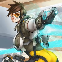 a blaster rifle, which is one of her abilities in the game. Behind her, there's