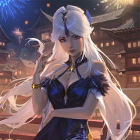 female character with long white hair. She is wearing a blue and black outfit that appears to be a fantasy or traditional-style dress, adorned with feather-like details. The character is standing on what looks like a balcony overlooking