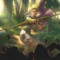 a fantasy setting. The background features a dense forest with towering trees and greenery that contribute to the overall
