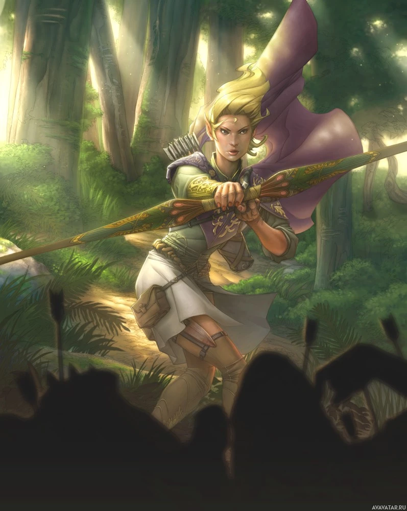 elf character. She is depicted holding a bow and appears to be ready for combat or hunting, given her stance and the way she's strung her bow. Her attire suggests she might be a skilled warrior or hunter within