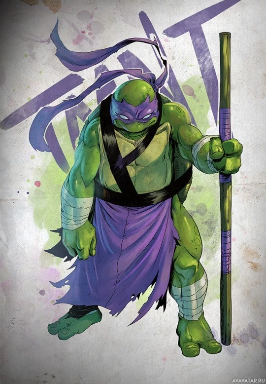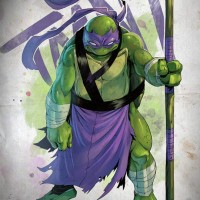 Ninja Turtles, specifically Donatello. He is shown in a stylized illustration, standing with one hand on his hip and the other holding
