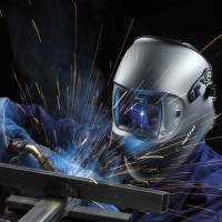 protective gear. This individual is using tools to weld or perform some type of metalwork. There are sparks flying around the area where the tool is making contact with the material, indicating that it's an intense process, possibly involving cutting, drilling, or shaping. The background appears to be