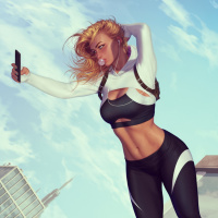 an active pose, leaning forward with her arms outstretched as if she's about to take a selfie. She is wearing athletic attire and is situated on what appears to be a rooftop or balcony of a building, with
