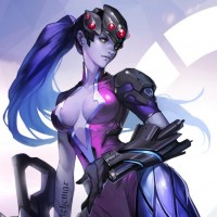 a female character from the popular video game "Overwatch." She is depicted as Widowmaker, a character known for her abilities related to sniping and assassination. The character is shown with long