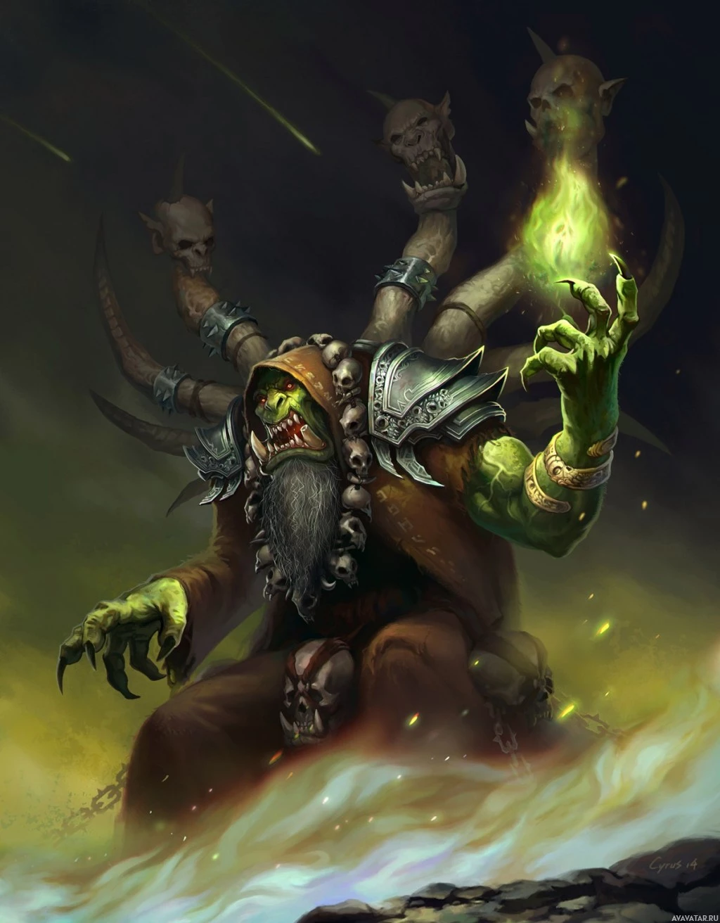 dark magic or ritualistic activity, which aligns with the character's depiction as a mystic or sorcerer.