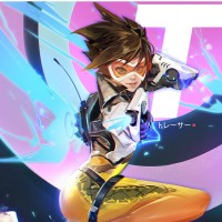 dynamic pose, with a determined expression. The artwork captures the energy and speed that are integral to Tracer's abilities within the game. The background elements suggest