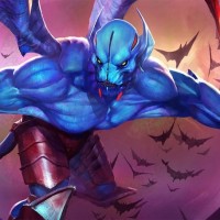 glowing eyes, which contribute to his demonic appearance. The background is dark with hints of purple and blue tones, enhancing