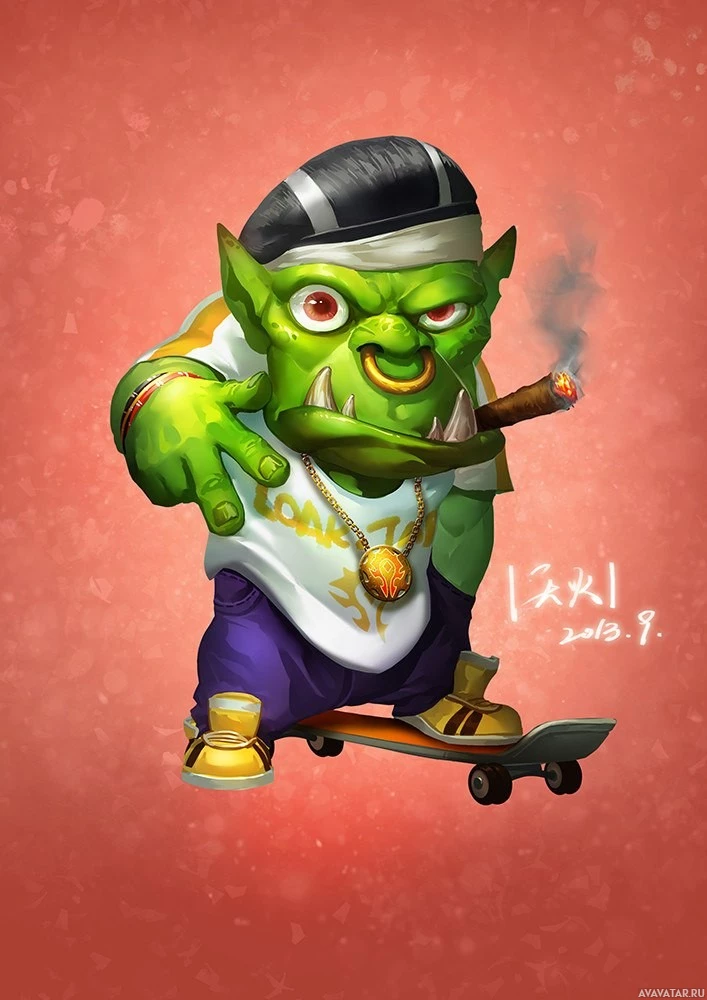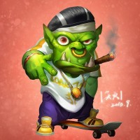 an illustrated character that appears to be a fantasy-style orc, skateboarding and holding a lit cigar. It is depicted in a cartoonish style with