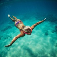 The picture shows a person in the water, wearing goggles and what appears to be a swim cap. The individual is floating face down on their stomach with hands outstretched. The water looks clear and is likely part of a tropical or subtropical environment.