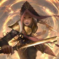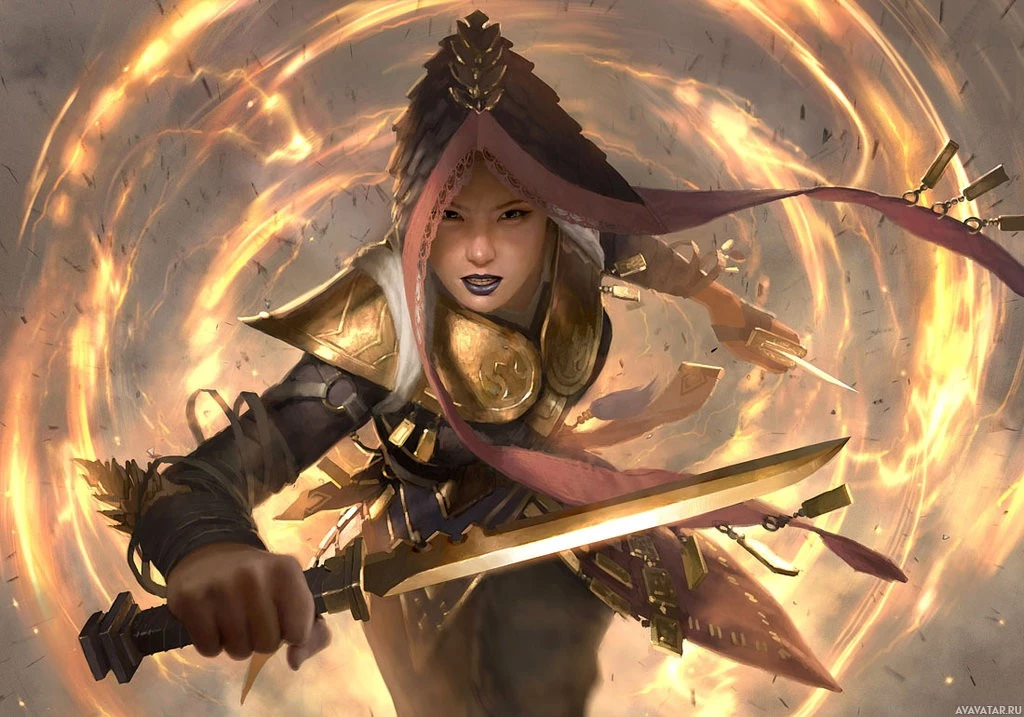 playing game or a fantasy narrative. There's also a visual element of energy or magic surrounding her, indicated by the golden rings around her figure and the fiery background, which could imply that she is casting a spell or engaging in combat with