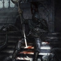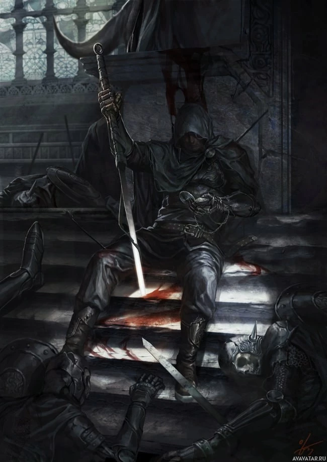 The image depicts a warrior sitting atop steps, surrounded by the bodies of slain soldiers. He is holding a sword and wearing armor with a hood that obscures his face. The scene suggests