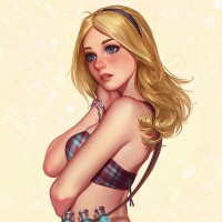 blonde hair and is wearing a plaid bikini top with her hands placed on her hips, giving off a confident stance. Her pose is somewhat reminiscent of the character