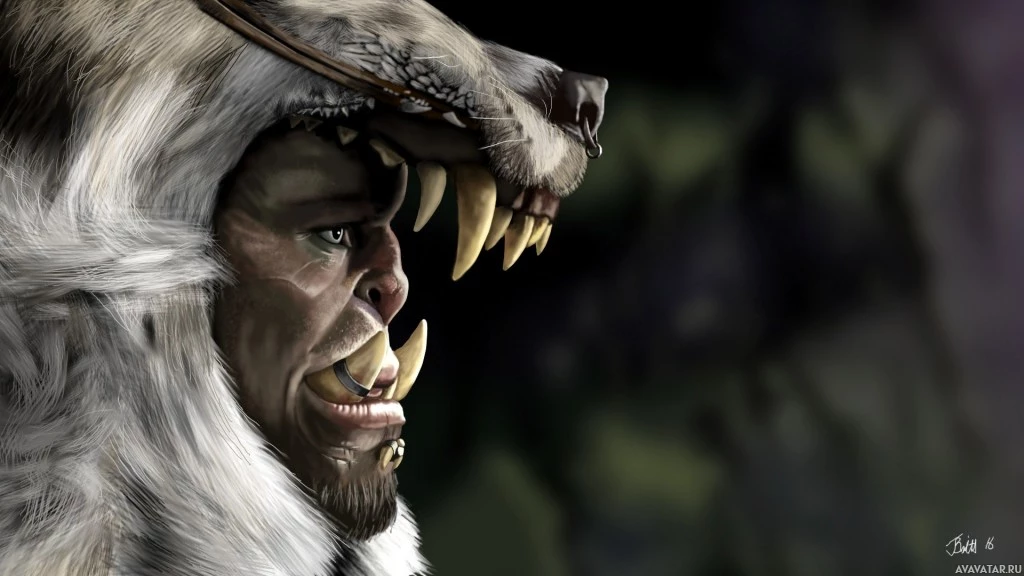 Картинка показывает фэнтезийного орка. Этот персонаж имеет видные черты, такие как большие уши, острые зубы и пушистый вид, напоминающий волка или оборотня. Важно отметить, что это творческое представление, а не реальный человек.