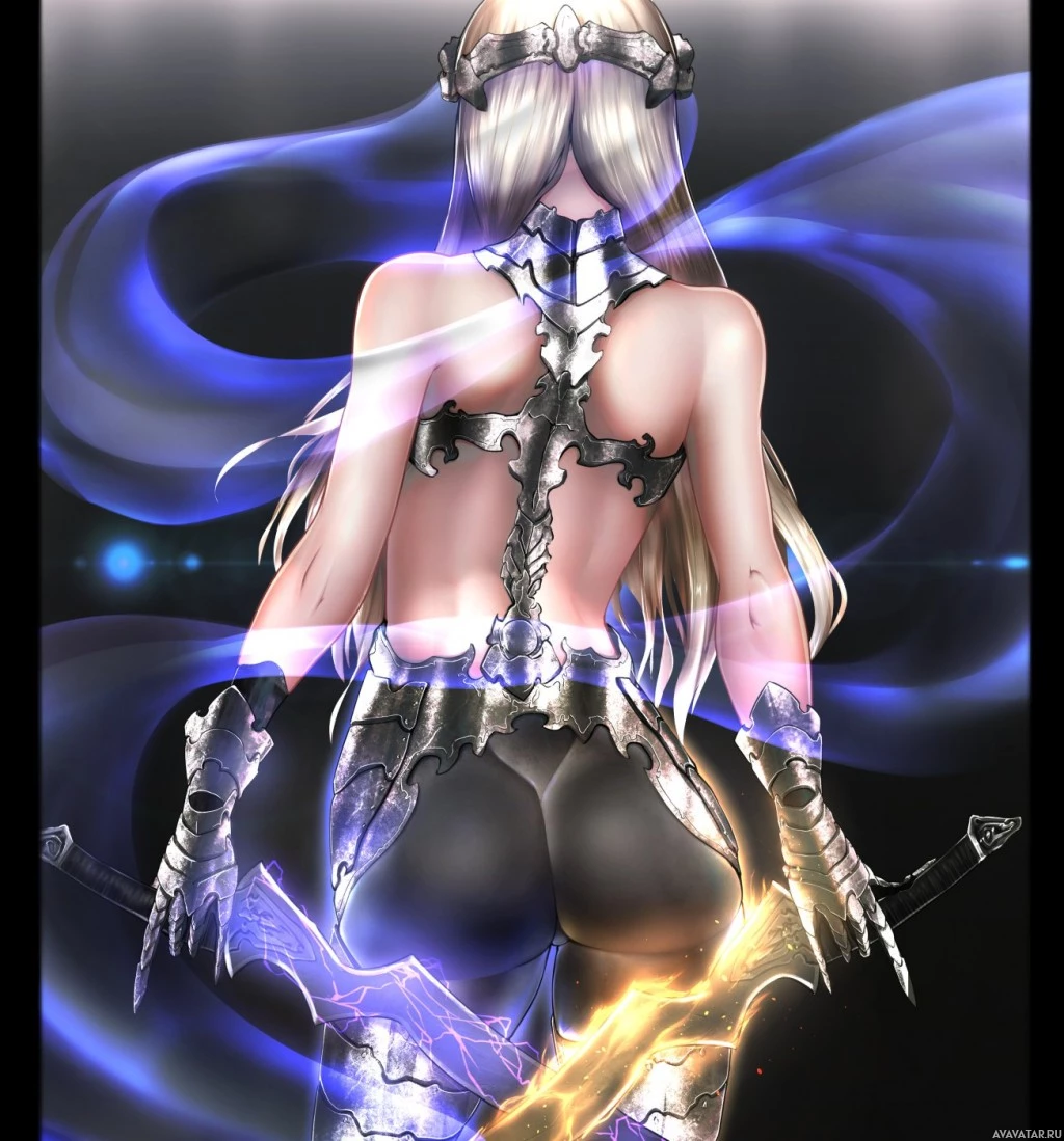 a female character. She is depicted from behind, wearing armor with a design that suggests she might be a warrior or a fighter in the context of this