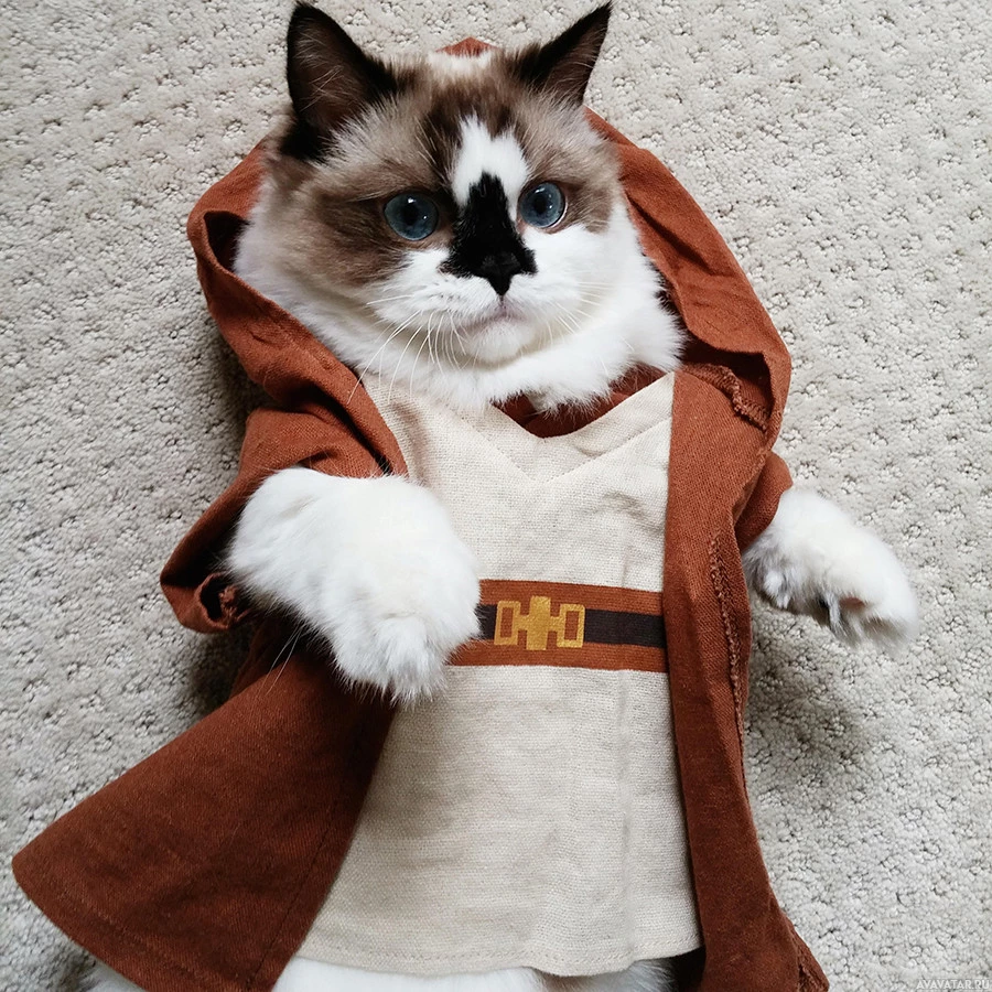 the Star Wars franchise. The cat is wearing a brown robe, resembling what Luke would wear in the movies, complete with