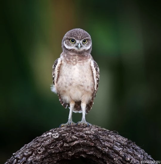 На картинке изображена сова, сидящая на ветке дерева. Это маленькая птица с коричневым оперением и большими, круглыми желтыми глазами. Фон размыт, но, по-видимому, является естественной средой с зеленью, возможно, лесом или лесом.