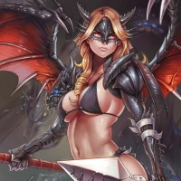 a fantasy character who appears to be a succubus, a mythical creature known for their seductive nature. This particular depiction shows the succubus with both human and demonic traits; she has red wings like a demon and horns on her head, but also human-like features such as