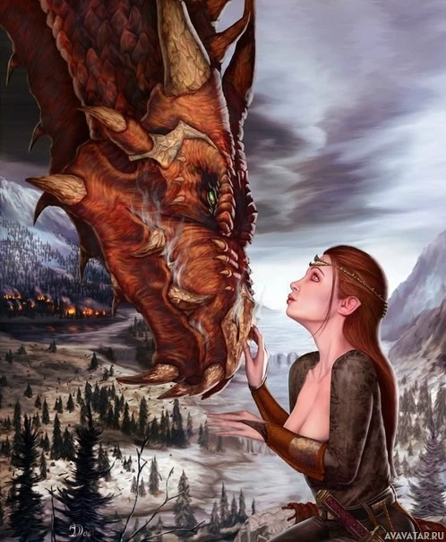 a fantasy scene where a red-haired elf woman is interacting with a dragon. They appear to be in