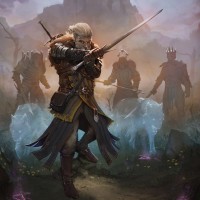 spectral figures that suggest a magical or supernatural environment. The character's pose and the intensity on his face convey