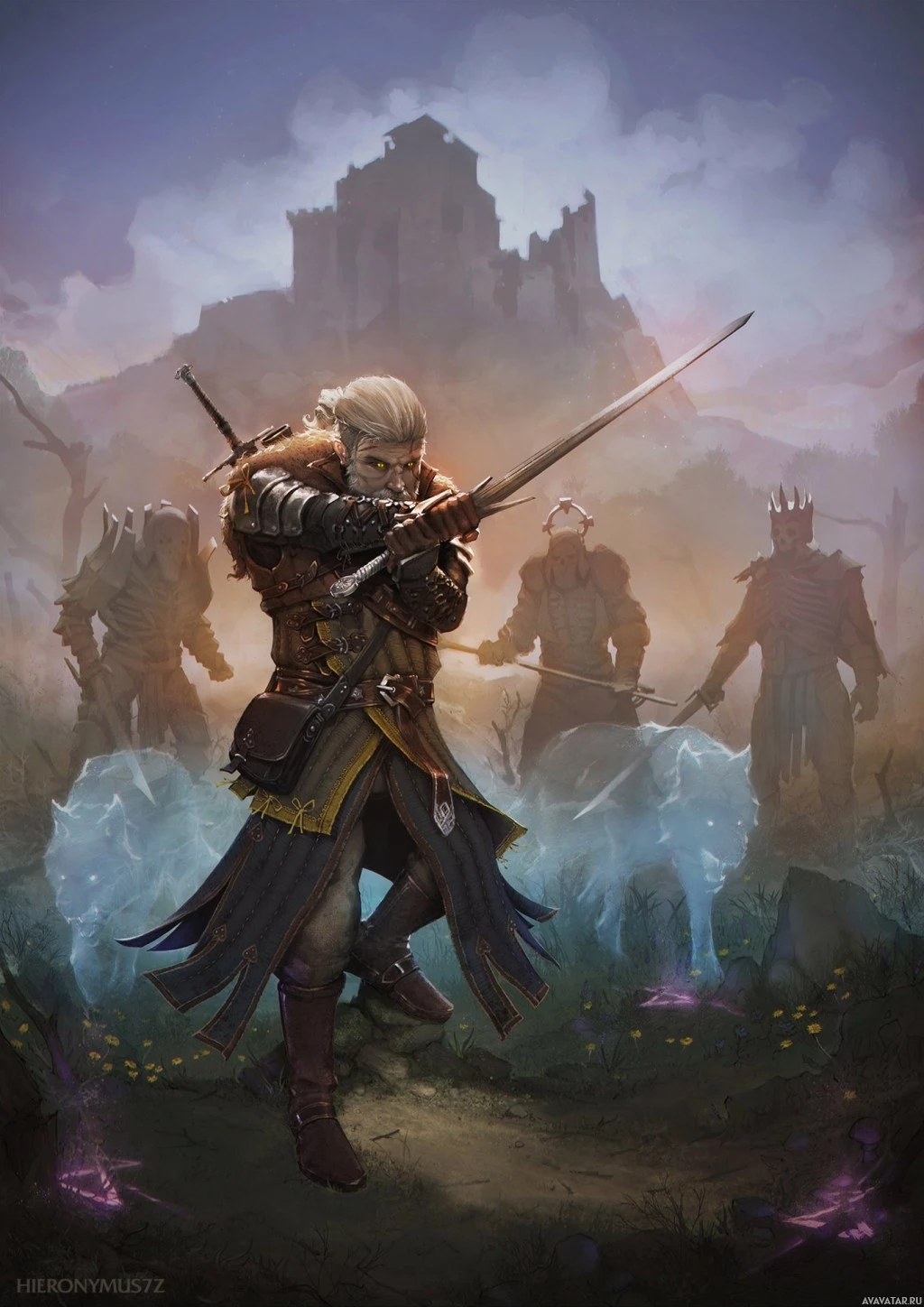 Geralt of Rivia, the main protagonist of the series. He is shown with his armor and swords, standing in a fantasy setting with elements such as fog, ruins, and