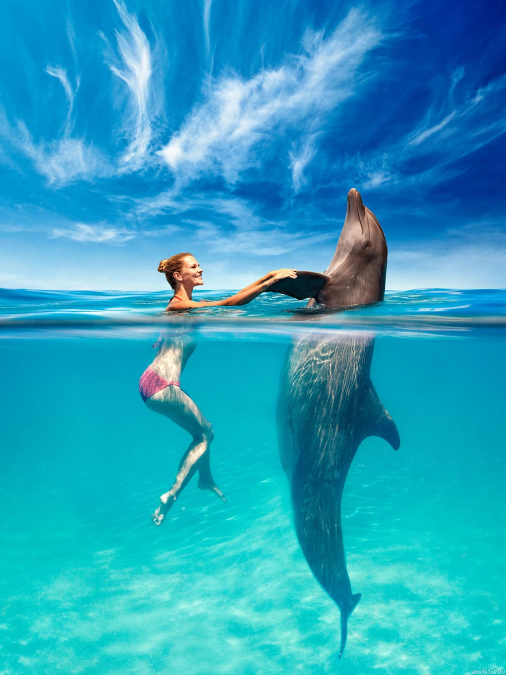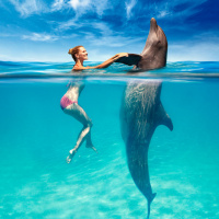 The image depicts a woman enjoying a close encounter with two dolphins. The woman is wearing
