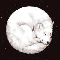 The image shows an arctic fox curled up in a ball, appearing to be asleep. The fox is set against a backdrop of the moon with a starry night sky surrounding it, conveying a sense of tranquility and peacefulness.