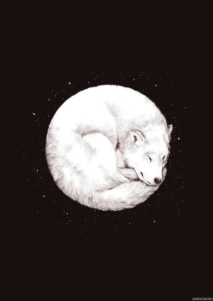 Картинка показывает арктическую лису, свернувшуюся в шар, которая, кажется, спит. Лиса установлена на фоне Луны со звездным ночным небом, окружающим ее, передающим чувство спокойствия и умиротворения.