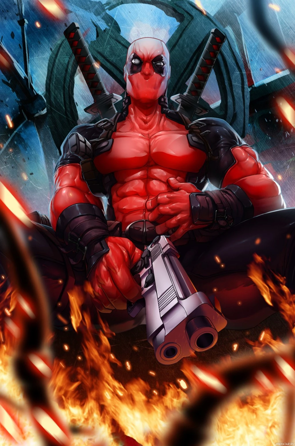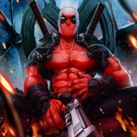 multiple weaponry on his body. Deadpool is holding two pistols and has a sword attached to each of his arms. The background suggests an intense