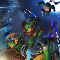 a distinct design and coloration that represents their individual personalities within the series: Leonardo, Michelangelo, Donatello, and Raphael. They appear to be engaged in combat against an unseen enemy, showcasing their