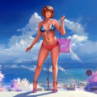 red hair, is wearing a blue bikini with a white stripe on the sides, and holding what appears to be a pink shopping bag. The setting suggests a bright,