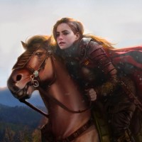 The image shows a person riding on the back of a horse. The rider is wearing armor and appears to be holding a weapon, suggesting they might be a character from a story or game set in a historical or fantasy context. They are outdoors with trees in the background, indicating that the setting could be a forest or a natural landscape.