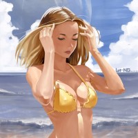 The image shows a woman on a beach. She has blonde hair and appears to be wearing yellow bikini bottoms with her top cropped out of the frame, leaving only her arms and shoulders visible. Her closed eyes suggest she might be in a moment of relaxation or enjoying the sun. In the background, there's an ocean view under a bright sky.