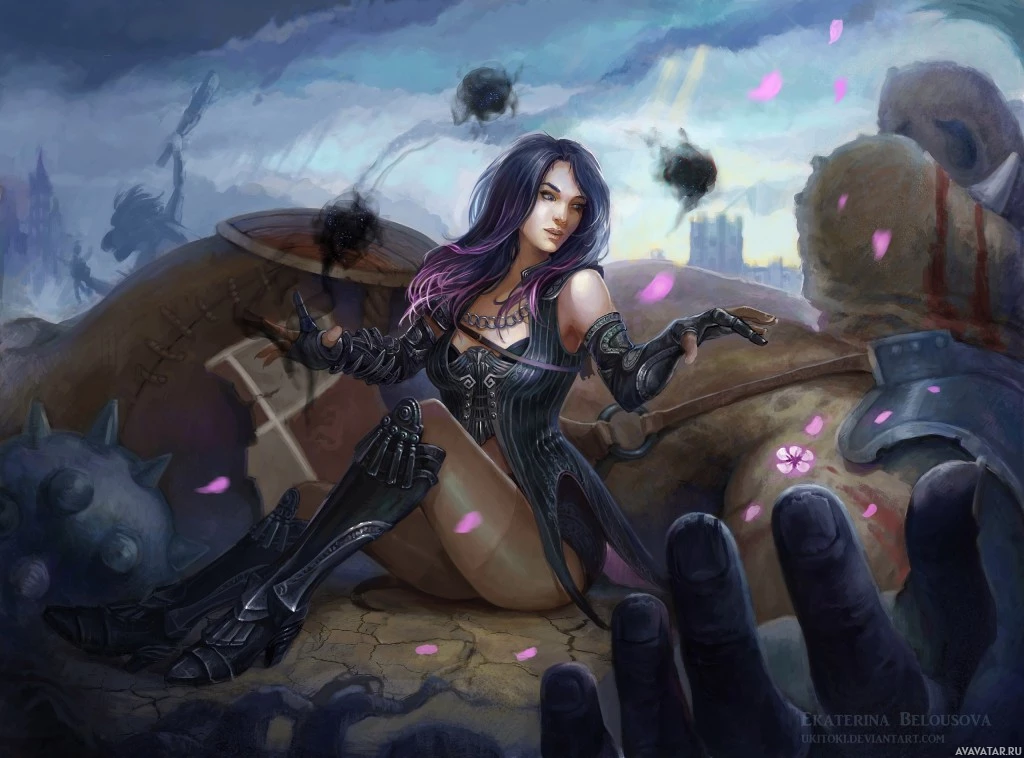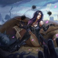 a female character with purple hair, dressed in fantasy-style armor and holding what appears to be a magical staff. She is sitting among rubble or ruins, suggesting that she might be a warrior or mage who has been involved in some